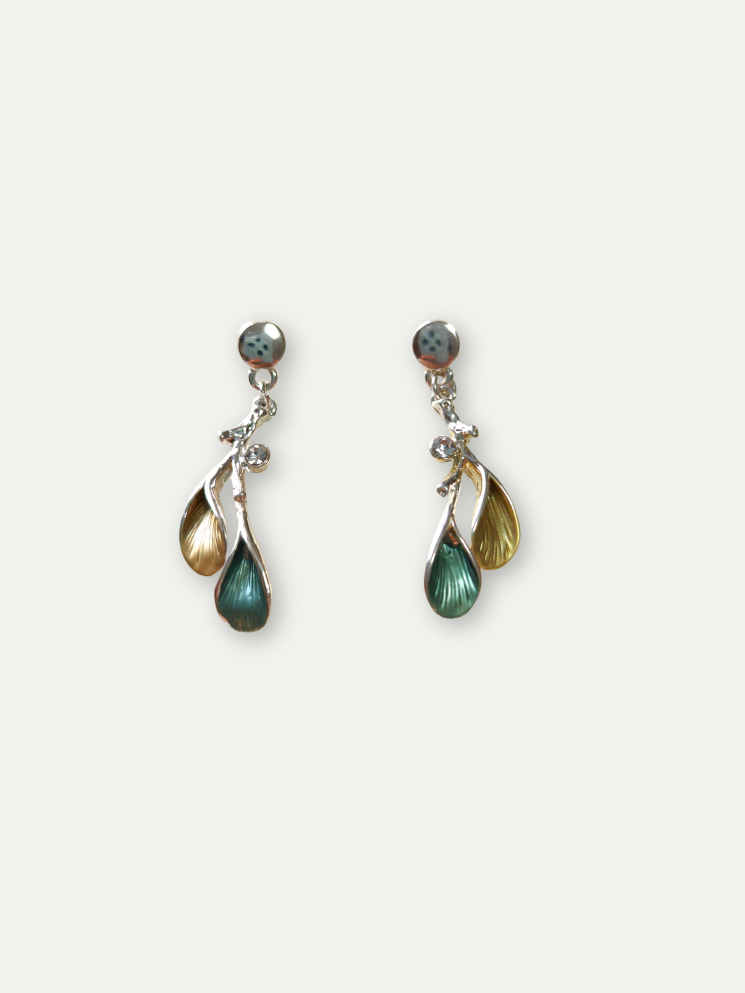 Inspiriert von sanft herabhängenden Blättern. Die geschwungene Silhouette, die lackierte Emaille-Oberfläche und die zweifarbige Tropfenform verleihen dem Design Eleganz und Dynamik, wie Blätter, die sich in einer sanften Brise wiegen.