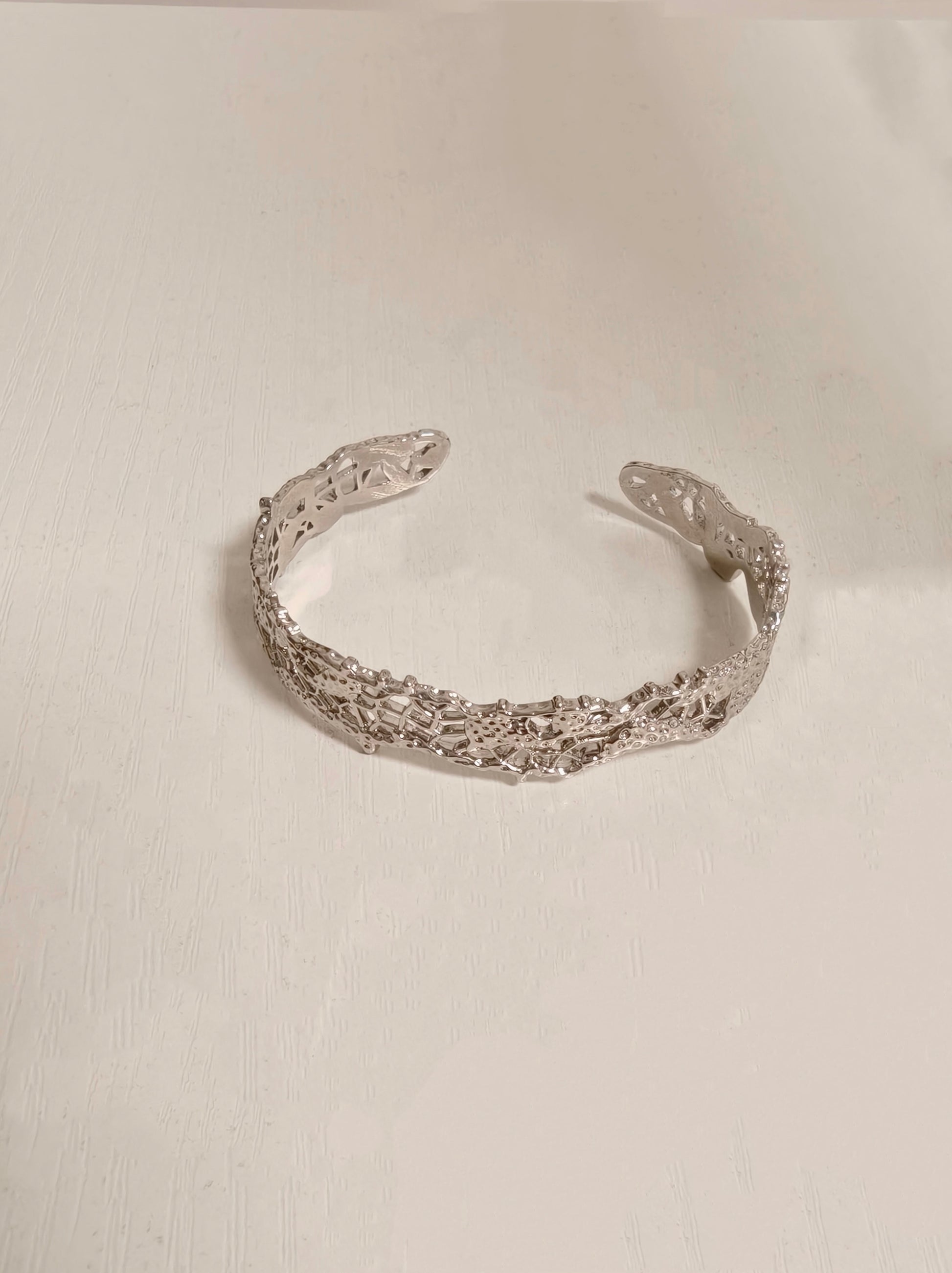 This bracelet mimics delicate lace with an organic, free-flowing texture. The gold-plated surface adds a soft sheen, blending elegance with the charm of artisanal craftsmanship.