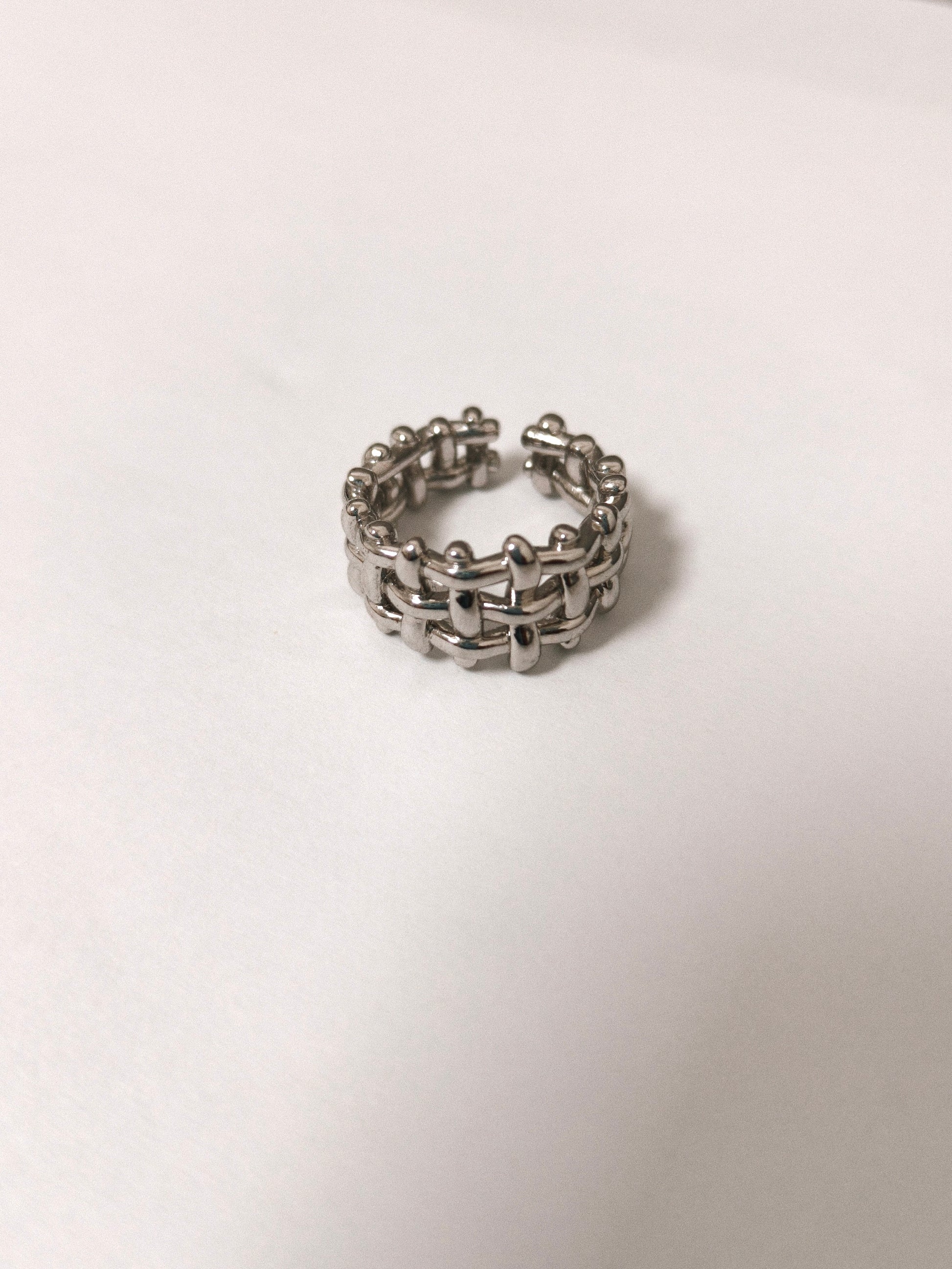 Crafted with a robust lattice structure, this ring features thick silver bands that deliver a strong architectural presence. Its weighty form and solid texture give it a bold, grounded feel on the hand.