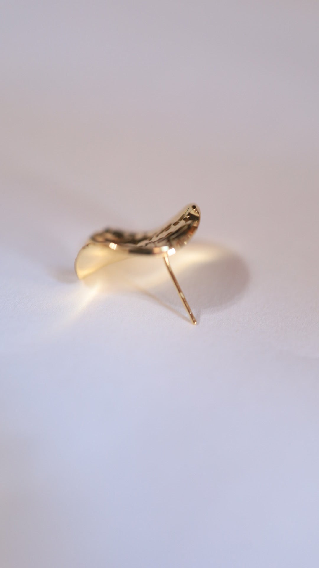These round gold-toned earrings feature an uneven, textured surface inspired by sun-dappled leaves. The organic, imperfect structure refracts light into shifting shadows—so the earrings appear slightly different from every angle, like sunlight dancing across nature’s surface. Bold yet quietly poetic.