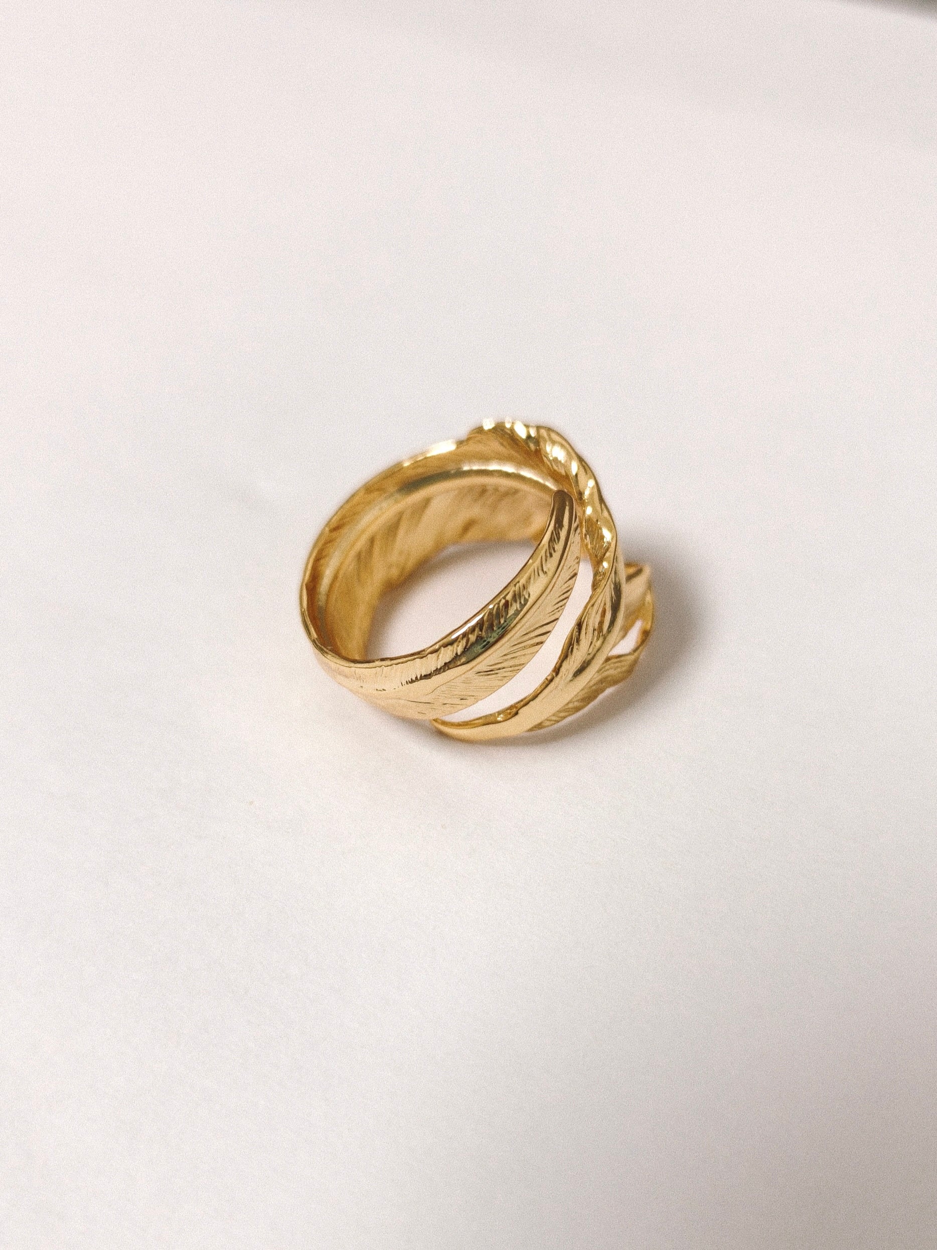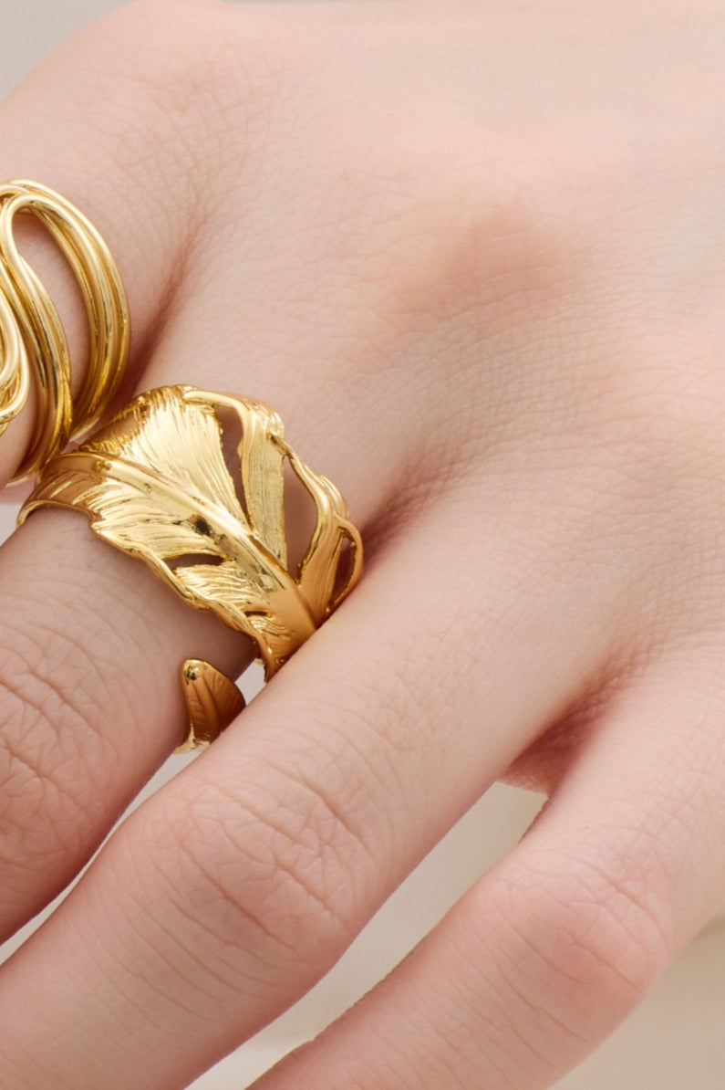 Part of our Garden collection, this ring wraps delicately around the finger in the form of layered, sculpted leaves. Each curve is detailed with fine vein textures and polished highlights, capturing the quiet elegance of nature. Its organic silhouette evokes the feeling of a golden leaf drifting gently in the wind